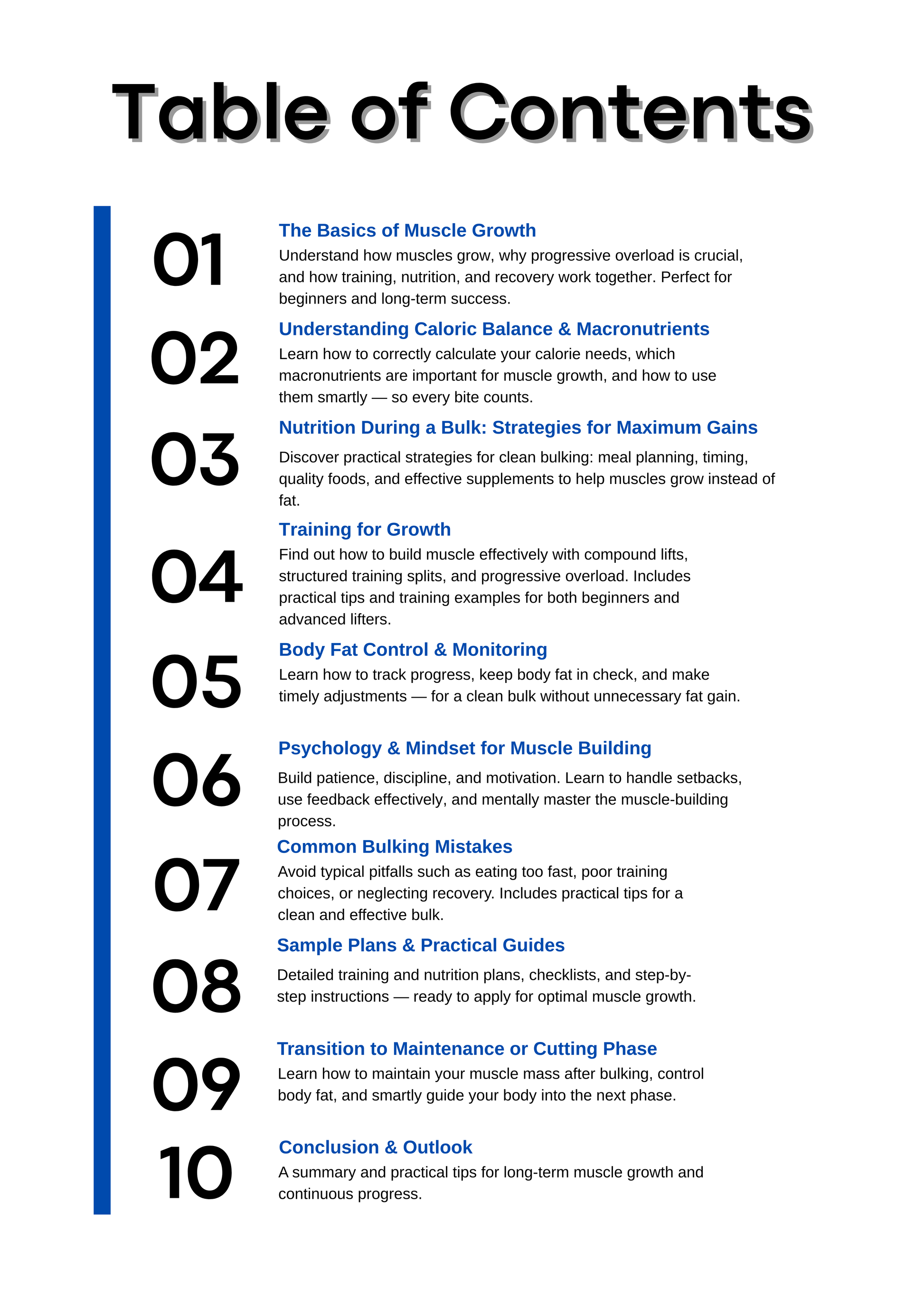 Dieses E-Book zeigt dir, wie du kontrolliert Muskelmasse aufbaust, ohne unnötiges Fett anzusetzen. Du erhältst einen klaren Leitfaden mit einfachen Ernährungsstrategien, effektiven Trainingsprinzipien und praxistauglichen Plänen, die du direkt anwenden kannst.